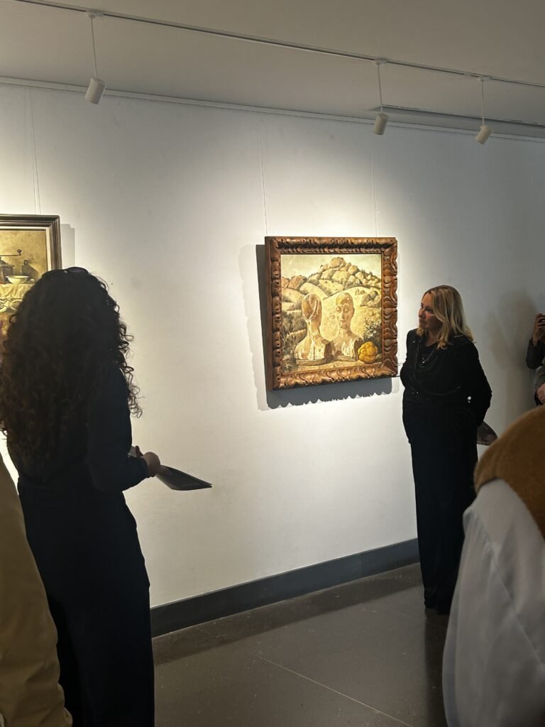Tras la inauguración, la comisaria Sonia Mª González ha realizado una visita guiada de la muestra explicando cada una de las doce obras que la componen. Por orden cronológico: “Narciso”, “Mañana de Otoño en el Retiro”, “Plaza de toros sobre el pueblo”, “Éxodo IV. La partida”, “El corredor”, “El tragaluz”, “Historia de una vida”, “Microcosmos”, “Al fondo una habitación vacía”, “Fuera del tiempo”, Salzburgo”, “Las vírgenes de Torrelodones”. Sobre esta última, ambientada en el Monte de Los Ángeles de Torrelodones, la comisaria ha destacado el rostro de las dos vírgenes “con una expresión melancólica, como si estuviesen pensando en tiempos mejores”.