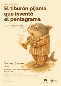 “EL TIBURÓN PIJAMA QUE INVENTÓ EL PENTAGRAMA«. Por Raquel Aranda. Viernes 16 de enero a las 18:00 h. Biblioteca José de Vicente Muñoz. A partir de 4 años. Aforo limitado. Invitaciones disponibles desde 1 hora antes del espectáculo en la Biblioteca.