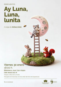 BEBECUENTO “AY LUNA, LUNA LUNITA«. Por Ainhoa Limón. Viernes 30 de enero a las 18:00 h. Biblioteca Juan Van-Halen. Dirigido a niños de 0 a 3 años. Aforo limitado. Invitaciones disponibles desde 1 hora antes del espectáculo en la Biblioteca.