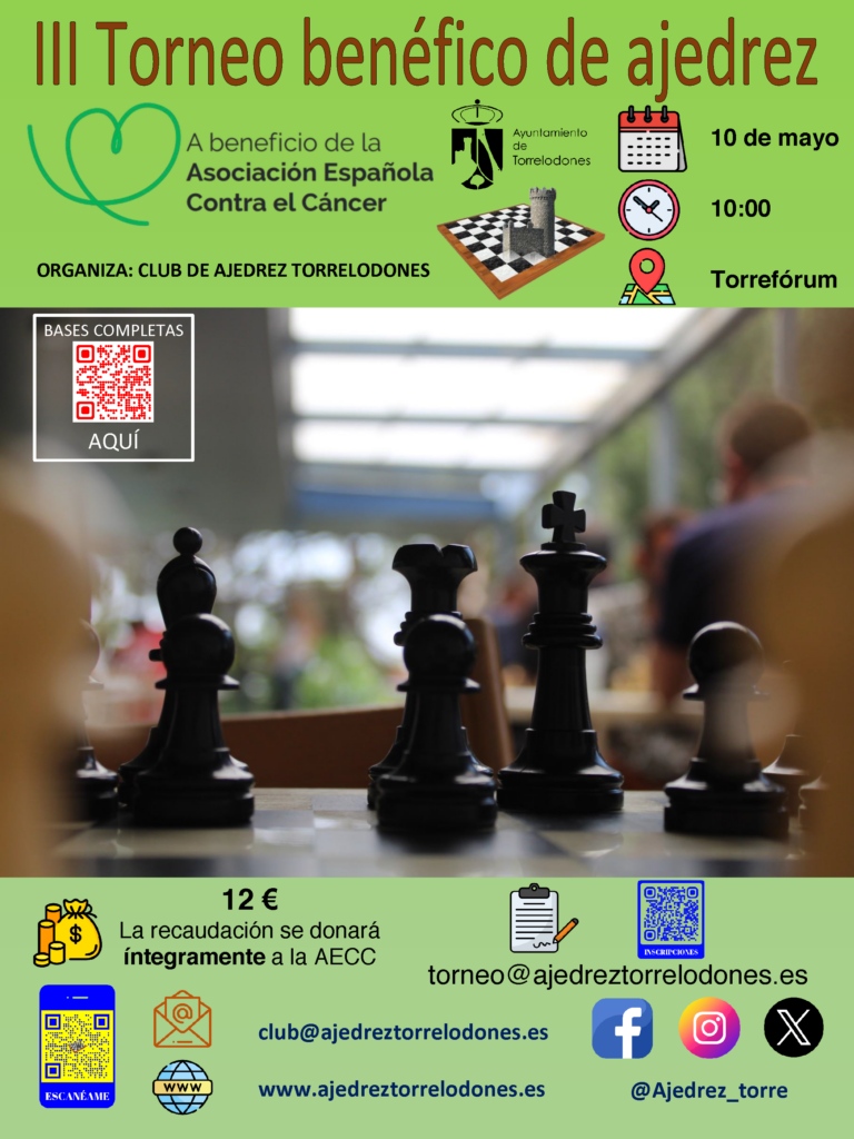Por tercer año consecutivo, el Club de Ajedrez Torrelodones en colaboración con el Ayuntamiento de Torrelodones organiza un torneo benéfico cuya recaudación se destinará íntegramente a la Asociación Española Contra el Cáncer.