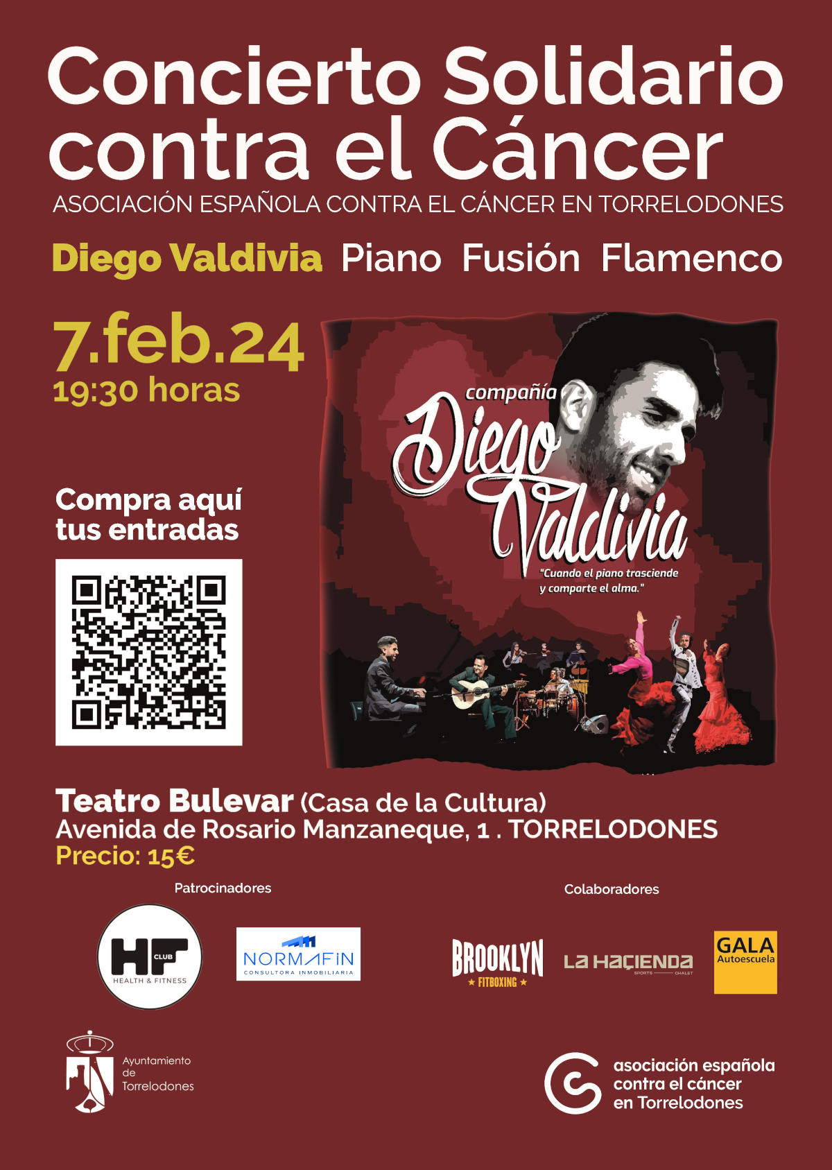 La Asociación Española contra el Cáncer de Torrelodones, en colaboración con el Ayuntamiento, organiza el Concierto solidario contra el cáncer Piano, Fusión, Flamenco: Diego Valdivia el 7 de febrero de 2025 a las 19:30 en el Teatro Bulevar.