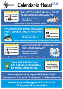 Por su parte, el Impuesto sobre Bienes Inmuebles de Naturaleza Urbana o Rústica (IBI) comenzará su periodo de pago voluntario del 15 de septiembre al 16 de noviembre. Las mismas fechas son para el Impuesto de Actividades Económicas (IAE), cuyo recibo se cargará el 16 de noviembre.