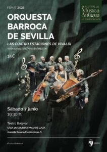 El cierre estelar de esta edición del Festival de Música Antigua de Torrelodones estará a cargo de la Orquesta Barroca de Sevilla. El sábado 7 de junio a las 19:30 h, en el Teatro Bulevar de Torrelodones sonarán las “Cuatro Estaciones de Vivaldi”, en un concierto que estará conducido por Stefano Barneschi, al violín.